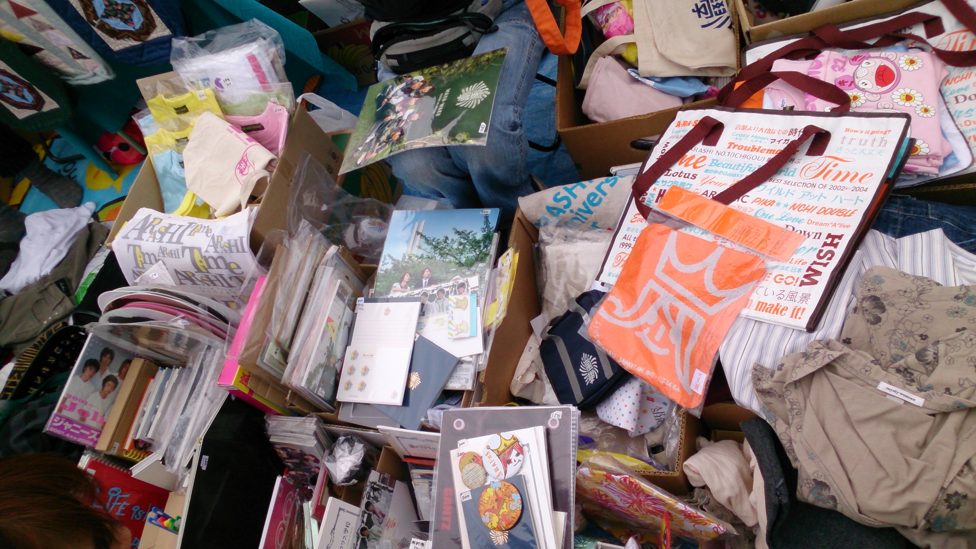 周っていたら娘たちの大好物の嵐グッツを大量に出品している所があり