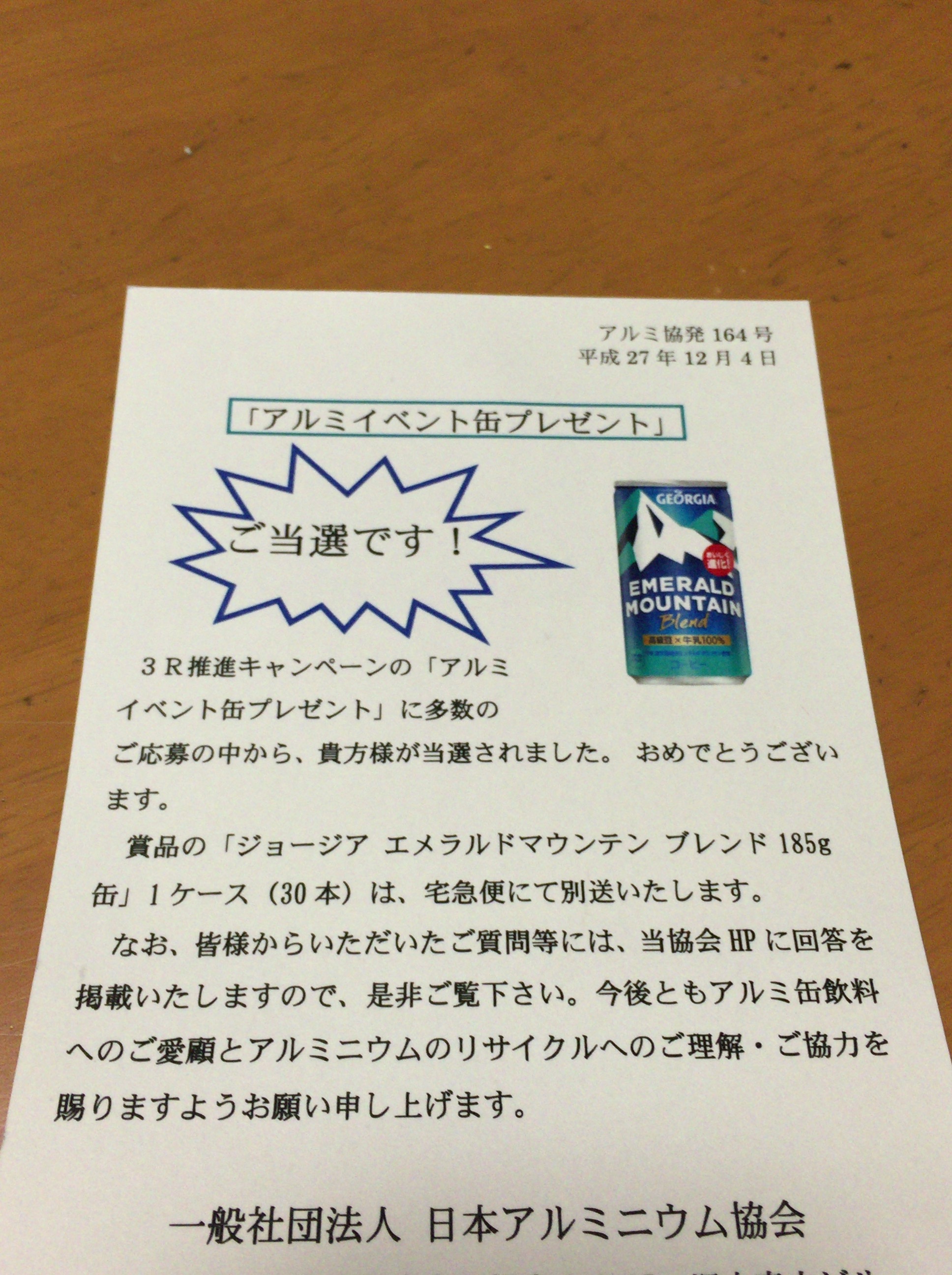 奥さんが、前にPCから応募していた懸賞品の、当選ハガキが今日、届きました。