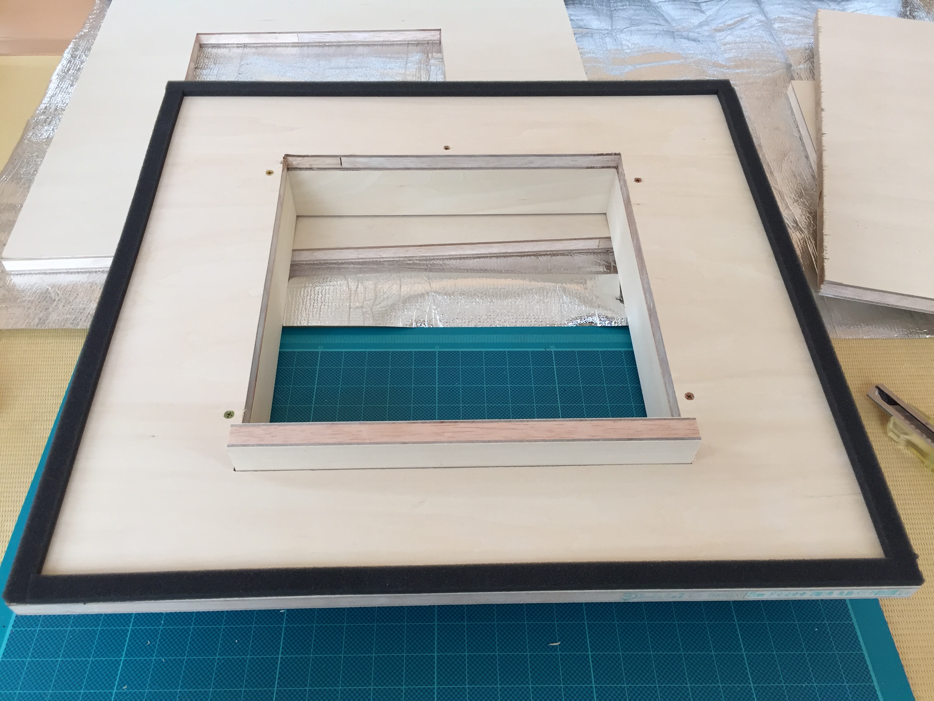 これも、四角くくり抜いた物と合体。裏面は窓枠にあたる所に隙間テープを貼っておきます。