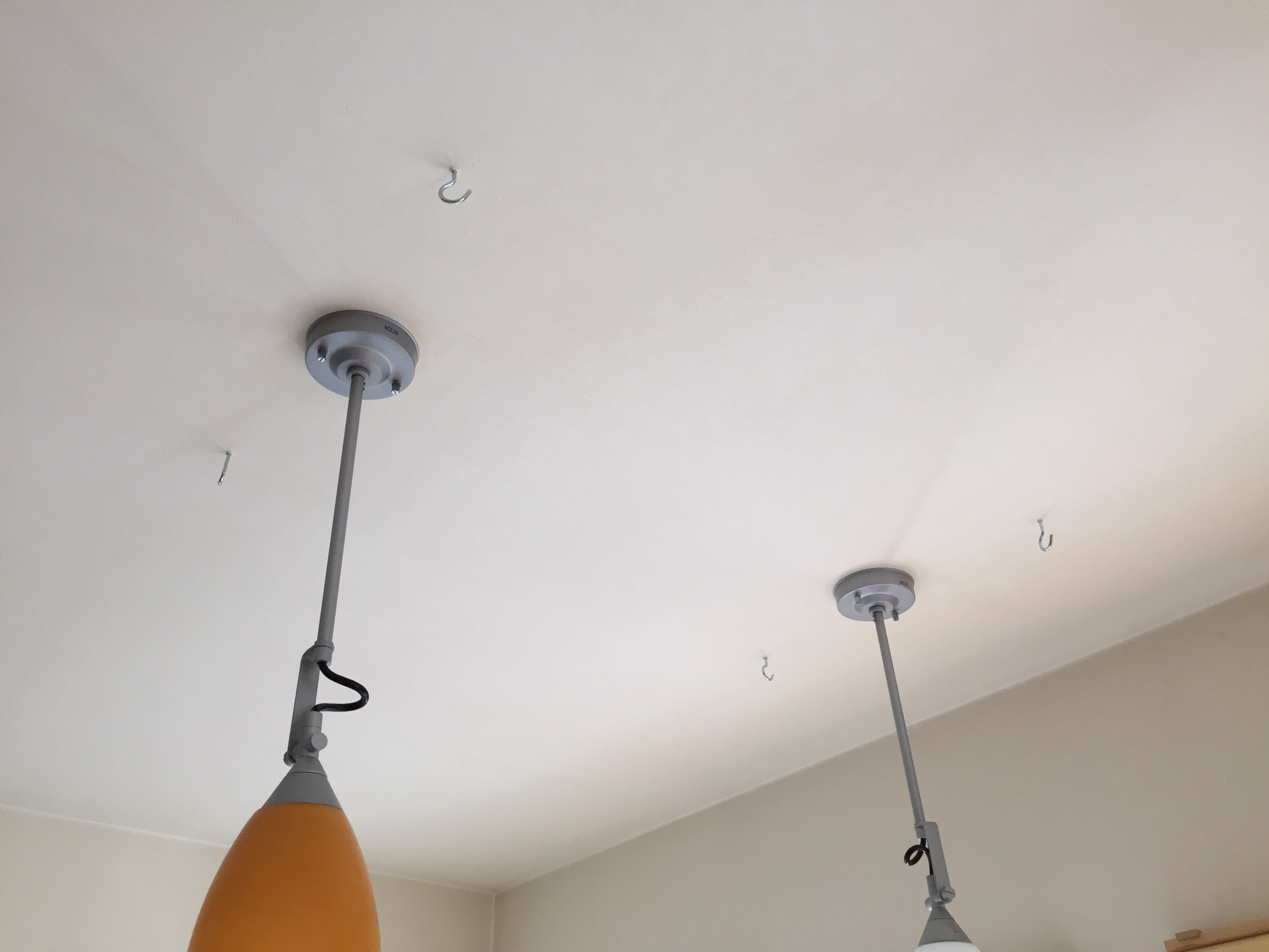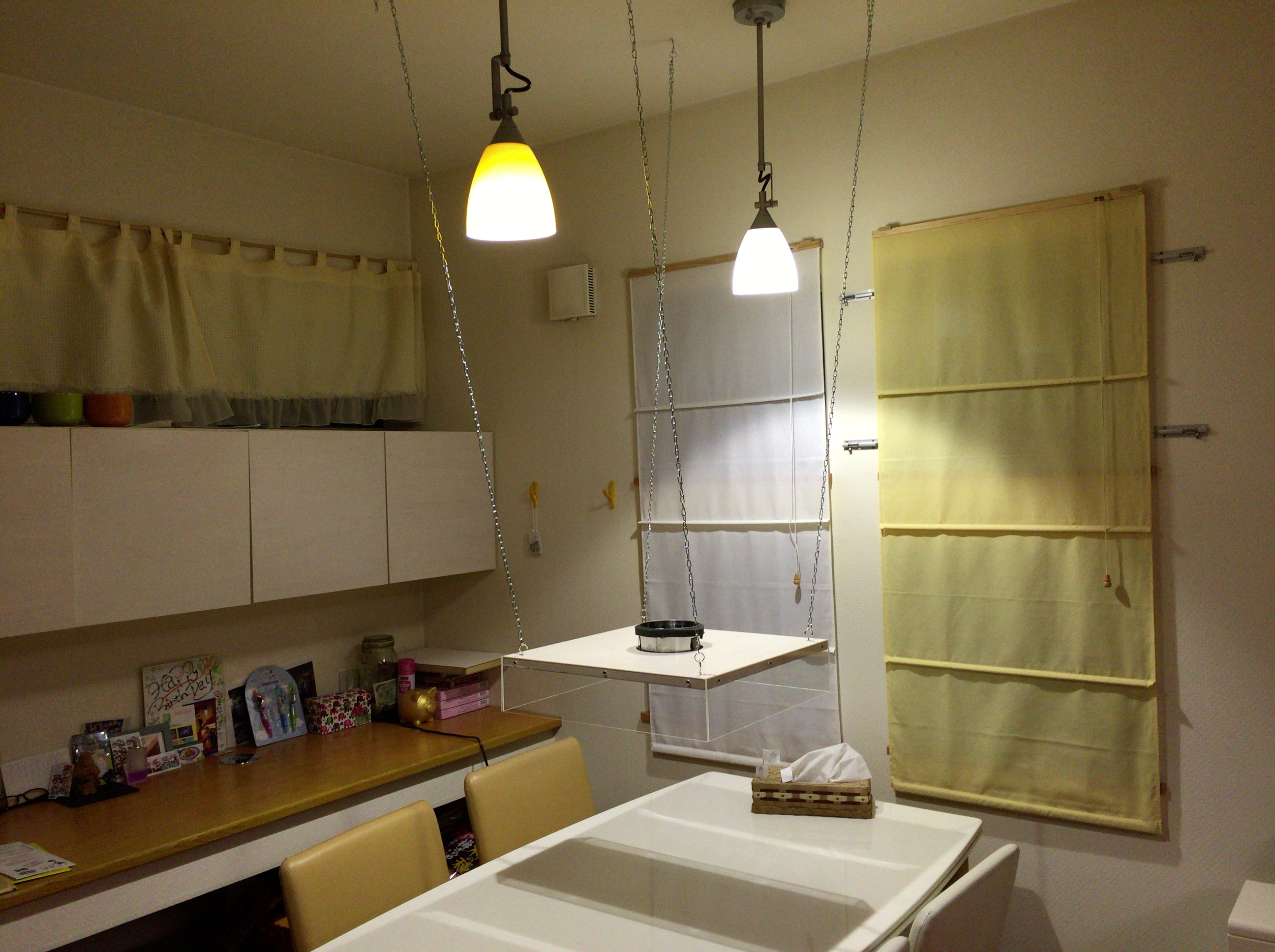 天井にフックを取り付けて、これにチェーンでフードを吊り下げます。