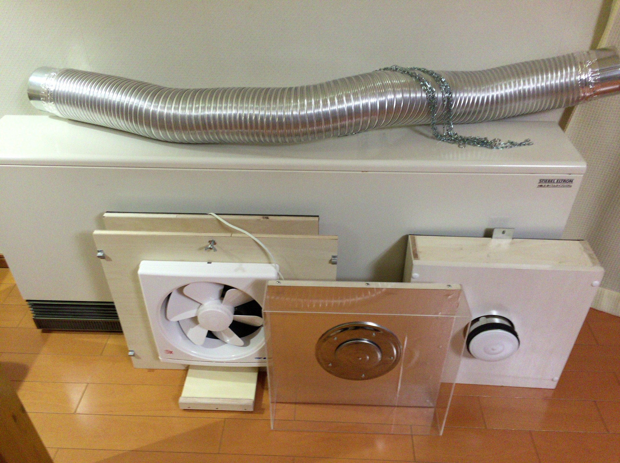 買ってきた材料は、250×250換気扇、アルミダクト125Ф、ダクト継手×2、煙突の化粧メガネ×2