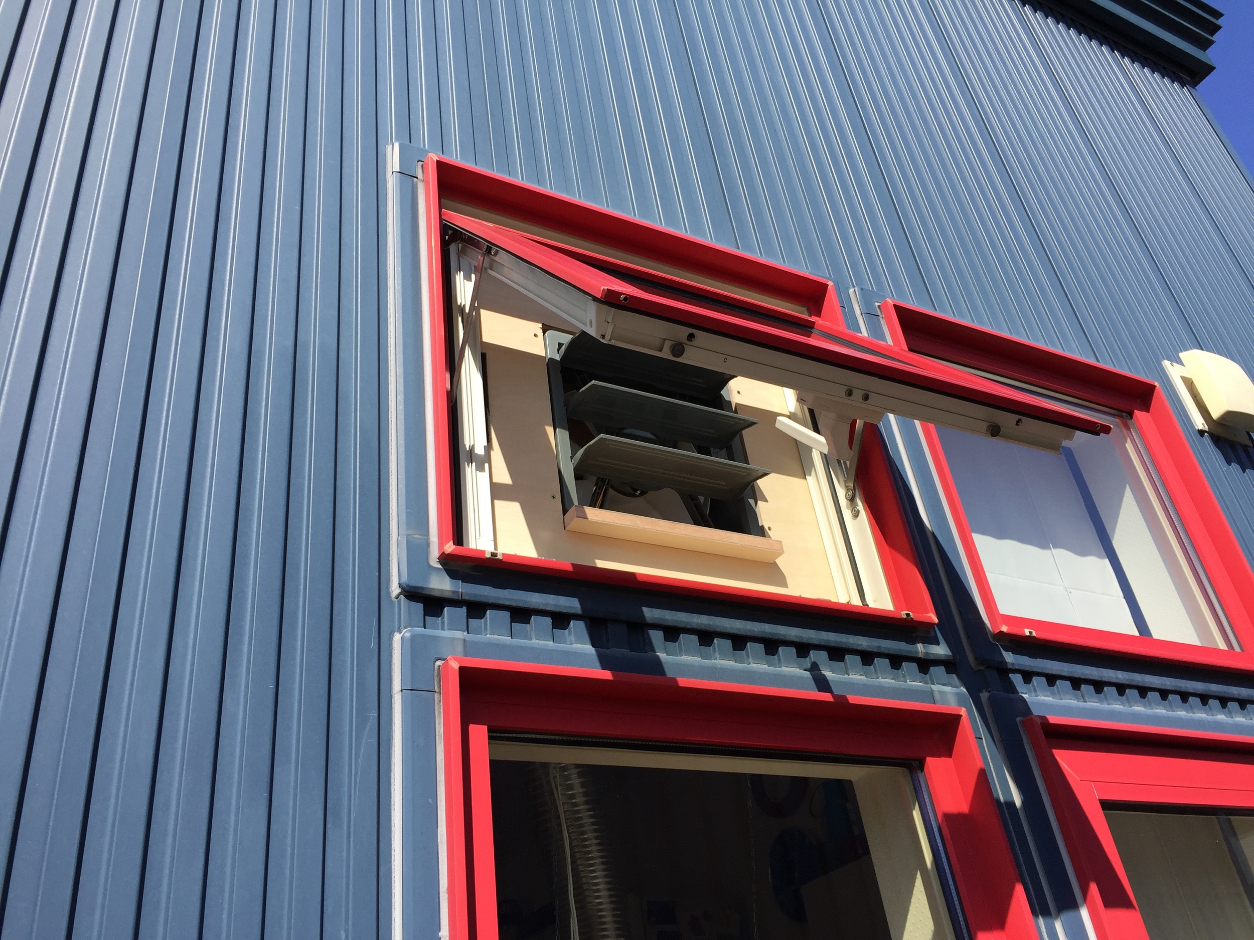 窓に固定して、フードも吊って、ダクトをつなぎました。